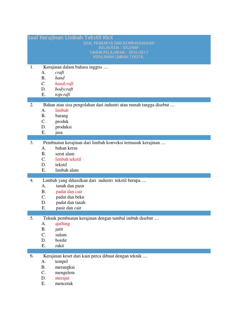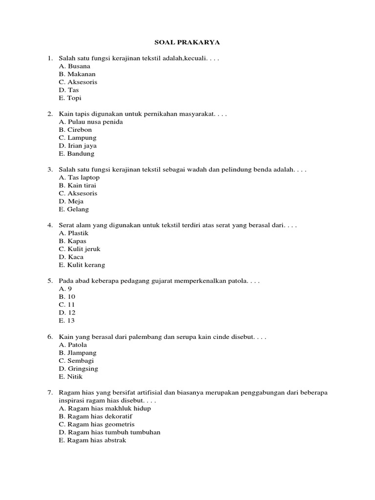 Contoh soal pilihan ganda tentang kerajinan tekstil. Selain itu, bagi anda yang ingin mempelajari atau mencari butir soal dalam bentuk essai/uraiannya, bisa. Soal pilihan ganda kerajinan tekstil. Berikut dibawah ini, soal pilihan ganda prakarya kelas vii semester ganjil dilengkapi kunci jawaban kurtilas edisi revisi dimulai dari pertanyaan nomor 11. Kain tapis digunakan untuk pernikahan masyarakat. Mar 5, 2019 | total attempts: Materi didasarkan pada buku paket parakarya kelas 7 smp/ mts kurikulum 2013 edisi revisi. Soal prakarya kelas 7 pts 2. Kemampuan untuk bekerja secara kreatif dan inovatif c. Latihan soal prakarya kelas 7 a. 20201002 contoh soal prakarya kelas 7 semester 1 dan 2 kurikulum 2013 dikesempatan kali ini yuksinaucoid akan membahas materi contoh soal prakarya kelas 7 kurikulum 2013 pilihan ganda pg beserta jawabannya. Mungkin artikel ini dapat menjadi referensi sobat untuk belajar memecahkan berbagai soal mengenai mata pelajaran prakarya yang khususnya kelas 7. Sahabat pendidikan, dalam menghadapi ulangan semester tentunya guru dan siswa akan disibukkan dengan persiapan menghadapi ulangan akhir semester.