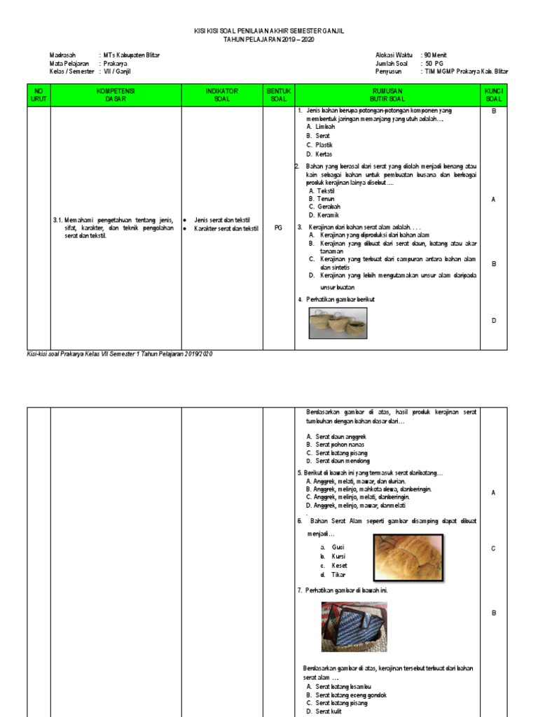 Prakarya kelas 7 semester 1 kerajinan serat remedial prakarya kelas 7 soal dan jawaban tentang serat tekstil soal essay prakarya kelas. Kunci jawaban soal prakarya kelas 9 kerajinan bahan keras. Soal tik kelas ix semester ganjil pilihan ganda pilihlah salah satu jawaban yang kalian anggap benar! Soal kerajinan tekstil kelas 7kerjakan soal berikut dengan cermatdan teliti. Kunci jawaban dapat anda download melalui link berikut. 20200722 soal pilihan ganda materi kerajinan dan wirausaha tekstil 1. Mungkin artikel ini dapat menjadi referensi sobat untuk belajar memecahkan berbagai soal mengenai mata pelajaran prakarya yang khususnya kelas 7. Soal dan jawaban kerajinan tekstil. Untuk memudahkan dalam belajar melalui sistem tanya jawab, kunci jawaban saya buat dalam spoiler atau sistem buka tutup. Soal pas prakarya smp kelas 7 kurikulum 2013/k13 ini merupakan contoh soal yang dapat dimanfaatkan oleh siswa maupun guru mata pelajaran prakarya atau guru kelas sebagai suatu contoh atau pandangan untuk membuat soal pas prakarya kelas 7 kurikulum 2013/k13.karena tugas seorang pendidik atau guru tidak hanya mengajar dan membuat buku kerja guru, tetapi juga membuat soal penilaian akhir semester. Sahabat pendidikan, dalam menghadapi ulangan semester tentunya guru dan siswa akan disibukkan dengan persiapan menghadapi ulangan akhir semester. Pastinya, materi akan diakhiri dengan proses perancangan dan pembuatan produk kerajinan tersebut. Seluruh siswa kelas 7 mau tidak mau harus segera mempersiapkan diri untuk menghadapi soal uts pts prakarya kelas 7 semester 1.